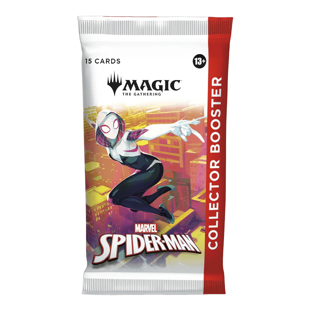 Your friendly neighbourhood Spider-Man swings into Magic: The Gathering, and not a moment too soon! Gather web-slingers from across the Spider-Verse and team up to take down the sinister foes that threaten the city. Keep your Spider-Senses primed to spot Borderless treatments that leap right off the page! Collector Boosters gather all the coolest cards and foil treatments in one place! Each booster contains Rares and/or Mythics, Traditional Foils, a Borderless basic land, and more. Web-slinging heroes may encounter even more beautiful foils and picture-perfect lands. You could also find the headliner card—the most collectible pull of all!