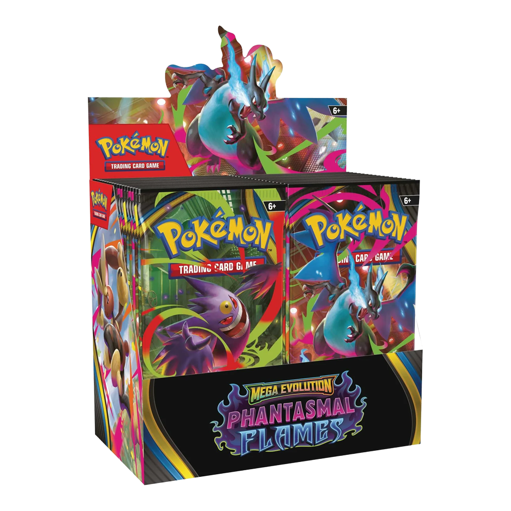 - Contains 36 booster packs from Pokémon TCG: Mega Evolution—Phantasmal Flames. (Each booster pack contains 10 game cards, 1 Basic Energy, and Pokémon TCG Live code card. Cards vary by pack.)
